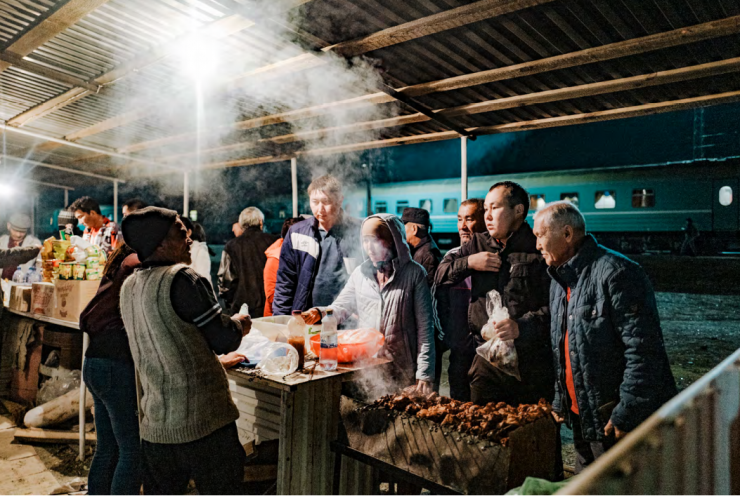 В казахстанских вагонах-ресторанах всегда бушует яркая атмосфера. Вагон наполнен смехом и запахом борща. Официантки приносят одну бутылку водки за другой, в основном для гостей мужского пола.