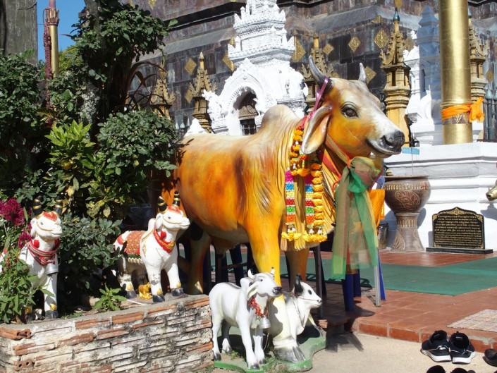 Есть на территории комплекса и другие постройки: часовня, колокольня, музей храма, еще один вихан. Но что показалось забавным, так это большое количество скульптур быков и телят – как будто в Индию попал (правда, по-моему, там были исключительно особи мужского пола). Я спросил об этом нашего гида. Он лишь грустно улыбнулся: "Сейчас не только простые верующие, но зачастую и сами монахи слабо разбираются в основах своей религии. Все это уже привнесенные из других религиозных традиций верования, не имеющие отношения к буддизму. Раньше этих пластиковых скульптур здесь не было - поставили совсем недавно. Потому что легче всего что-то взять извне, чем кропотливо изучать свою культуру, напрягая собственную голову. Проще говоря, это дураки, которые городят всякую ерунду". Не знаю, догадывался ли наш гид, что он лишь перефразировал старую русскую пословицу: "Заставь дурака богу молиться – он себе лоб расшибет".