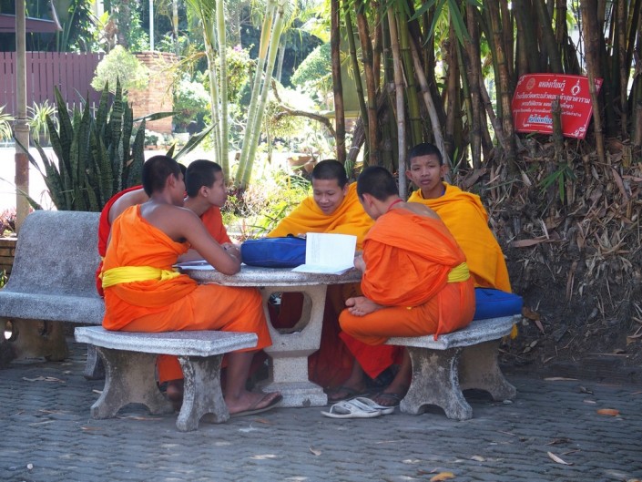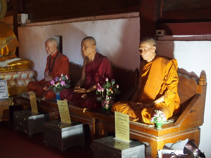 Наверное, киносеансы пользовались у монахов большим успехом, потому что в новом храме, сооруженном поблизости уже в начале XIX века (я про него упоминал), отверстие проделали специально, да еще установили в качестве экрана плиту на том месте, куда падали солнечные лучи. Появились и первые постоянные зрители. Когда мы зашли в этот вихан, то столкнулись с часто встречающейся традицией тайских храмов – восковыми фигурами в натуральную величину почитаемых монахов, служивших в этом храме в прежние времена. В сумеречном свете выглядели они как живые, и потому производили немного жутковатое впечатление.