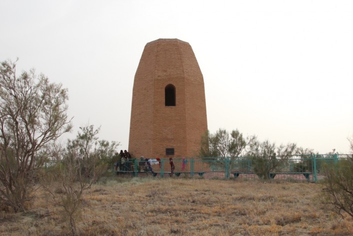 К вечеру экспедиция по сакральным местам страны "Киелi Қазақстан" добралась до пункта назначения. Один из ранних образцов башенных мавзолеев в Казахстане представляет собой восьмигранное строение с двумя ярусами. Общая высота здания - десять метров, диаметр у основания - 16 метров. Объект реставрирован и воссоздан по прежнему виду.