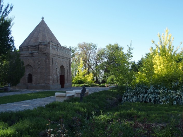 Знаменитый памятник XI–XII веков - мавзолей Айша-Биби - окружал очень искусно выстроенный ландшафт со специально подобранной гаммой солнечных оттенков: желтый песчаник, карельская береза, лаванда, желтая бузина.