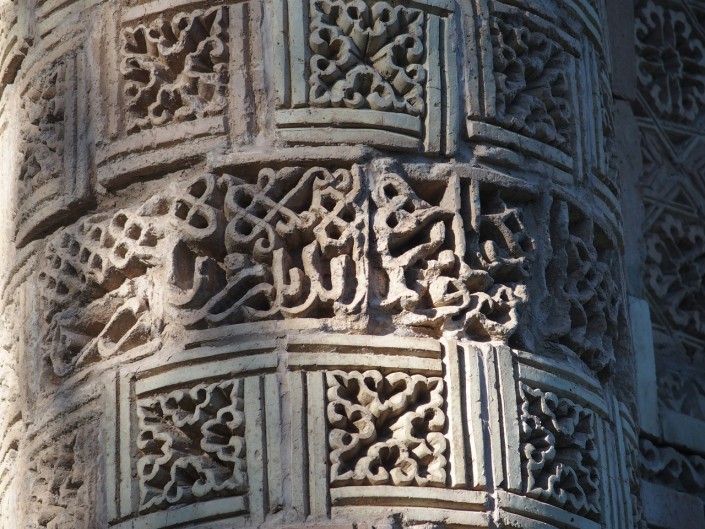 От первоначального строения до нас дошли лишь две выступающие колонны. На одной из них, на 18-й плитке снизу, сохранилась арабская вязь - плач Карахана по красавице Айше. Учеными было расшифровано всего несколько слов: "Осень, тучи на небе, жизнь прекрасна, любовь моя!".