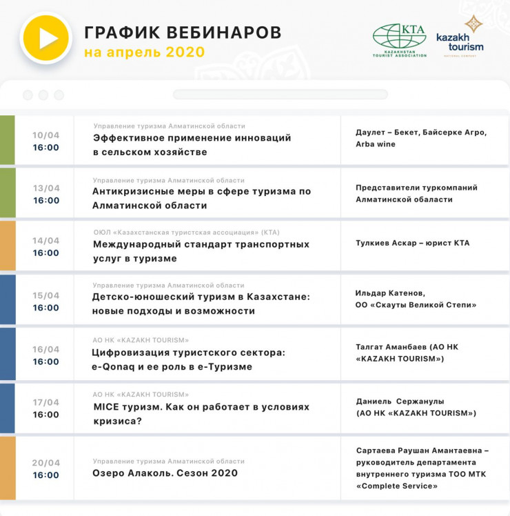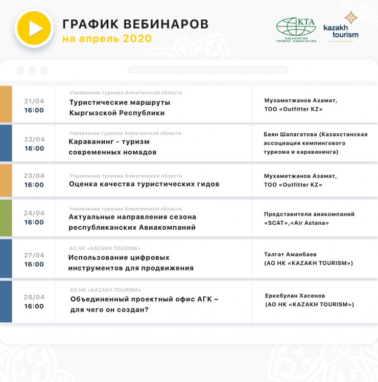"Пока вебинары расписаны до конца апреля, данная практика будет продолжена и после снятия режима ЧП. У вас есть не только уникальная возможность обучаться во время карантина, но и стать спикером и поделиться экспертизой в сфере туризма", - пояснил председатель правления АО НК Kazakh Tourism Ержан Еркинбаев.