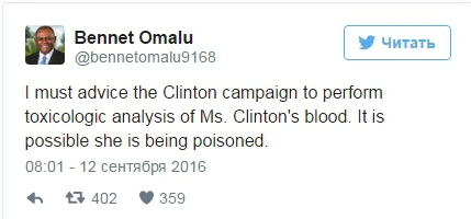 Известный американский судмедэксперт Беннет Омалу предположил, что причиной недавнего обморока Хиллари Клинтон, возможно, стало отравление. На своей странице в Twitter патологоанатом порекомендовал избирательному штабу демократов "сделать токсикологический анализ крови госпожи Клинтон".