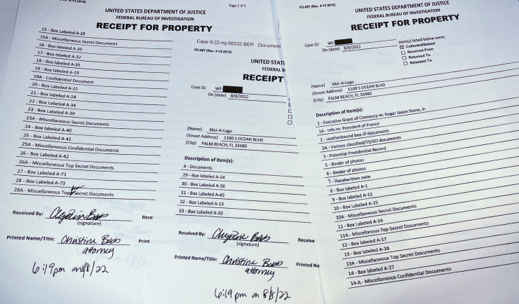 В результате из резиденции Трампа изъяли 11 комплектов документов, в том числе помеченных грифом "совершенно секретно"