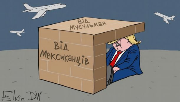 Карикатура, как Дональд Трамп спасается от мусульман и мексиканцев