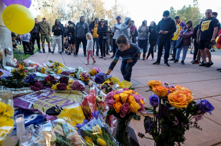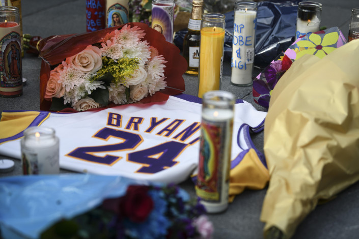 Болельщики несут цветы и ставят свечи около домашней арены "Лос-Анджелес Лейкерс" - клуба, в котором на протяжении 20 лет играл баскетболист.