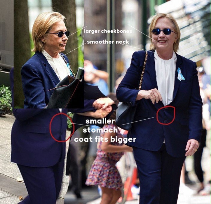 Сторонники теории заговора утверждают, что Клинтон подменили после того, как у нее случился обморок во время траурного мероприятия в Нью-Йорке, посвященного памяти жертв теракта 11 сентября 2001 года.