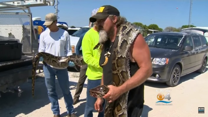 Дасти Крам принимает участие в государственной программе по уничтожению питонов в Южной Флориде. Охотнику за змеями платят около восьми долларов в час за его опасную работу. А за каждого пойманного питона мужчина получает премии, в зависимости от длины трофея.
