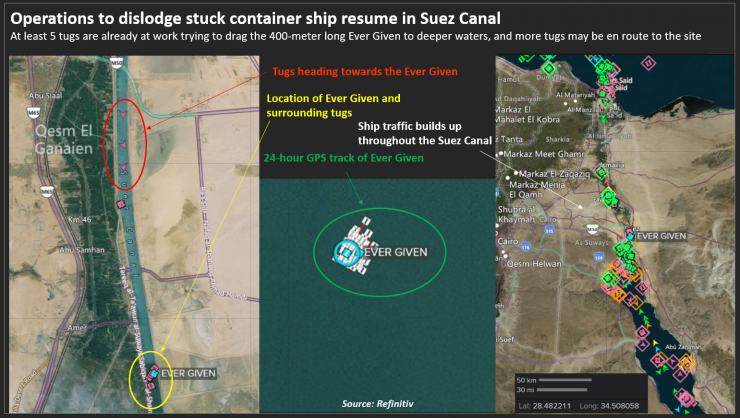 Үш күннен бері құтқарушылар кемені каналдан шығара алмай жатыр. Суэц каналы әкімшілігі (SCA) мәлімдемесіне сүйенсек, ең үлкен сегіз буксир Ever Given-ді каналдан шығаруға тырысқан, бірақ әлі нәтиже жоқ. GPS-сигнал соңғы 24 сағат ішінде кеме сәл ғана қозғалғанын көрсеткен.