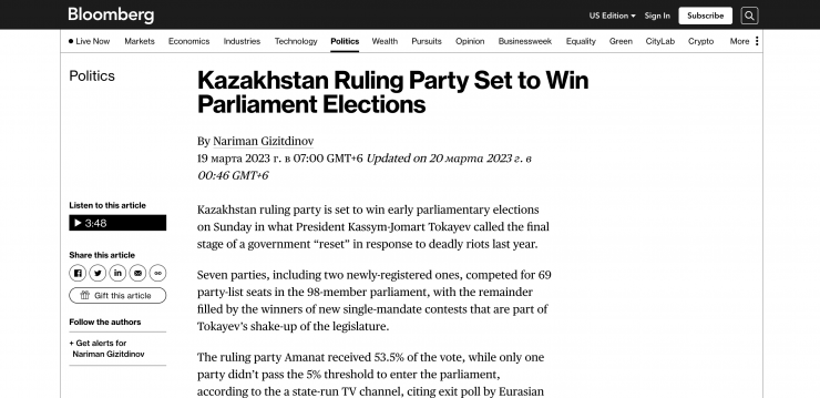 Агентство Bloomberg отмечает, что правящая партия Казахстана должна выиграть досрочные парламентские выборы, которые Президент назвал заключительным этапом "перезагрузки".