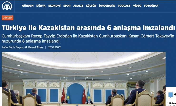 Крупнейшее турецкое информационное агентство "Анадолу" сообщило, что по итогам переговоров лидеров Казахстана и Турции был подписан ряд документов. В материале были названы все шесть подписанных соглашений.
