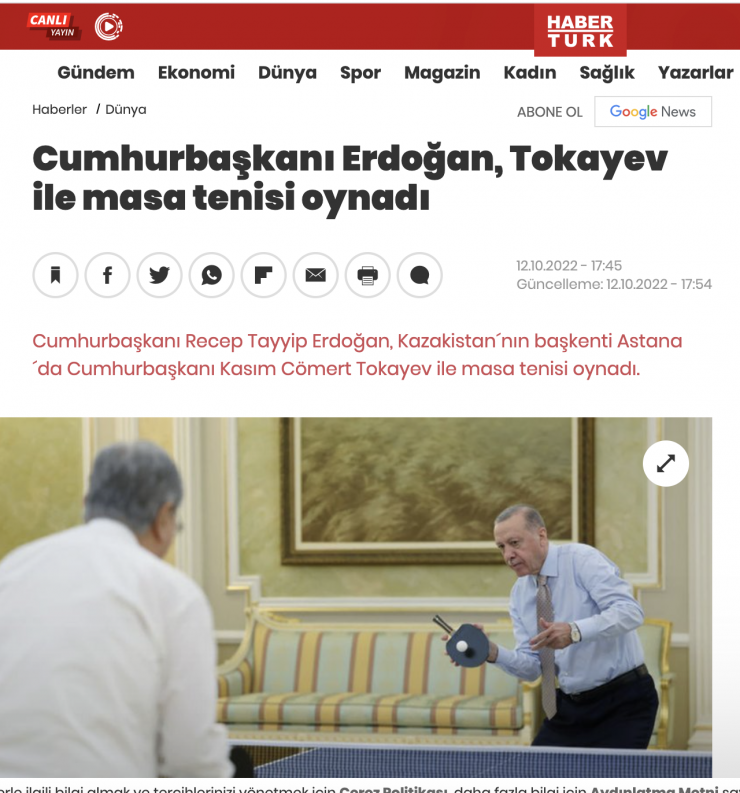 В турецком издании Habertürk выпустили материал с заголовком "Президент Эрдоган сыграл в настольный теннис с Токаевым".