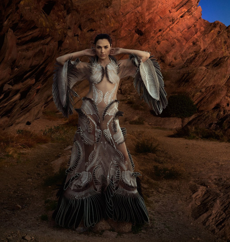 Для майского номера женского журнала о моде 34-летняя знаменитость позировала на фоне красноватой скалы в длинном платье из полупрозрачной ткани с нашивками светлого и темного тонов, имитирующими перья птицы, рукава наряда выполнены в виде крыльев.