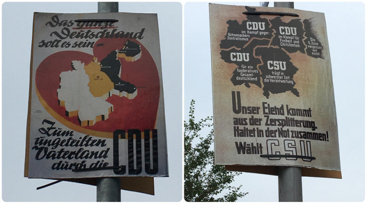 На улицах немецкого города Тетеров (земля Мекленбург - Передняя Померания) появились предвыборные плакаты партий Христианско-демократический союз Германии (ХДС) и Христианско-социальный союз (ХСС) 72-летней давности, сообщает Tengrinews.kz со ссылкой на Вести.Ru.
