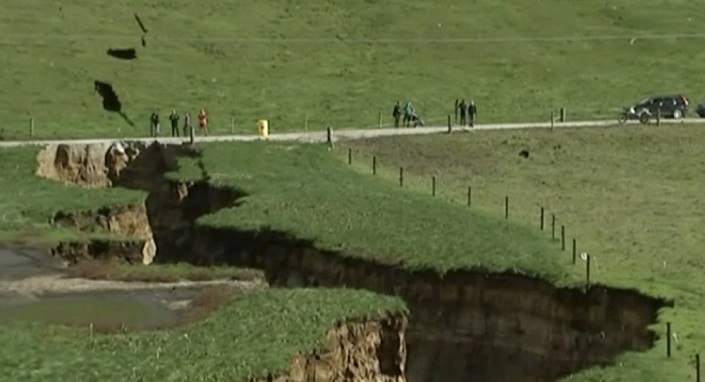 В Новой Зеландии близ города Роторуа образовался громадный разлом в земле. Трещина достигает 200 метров в длину (два футбольных поля) и 20 метров в глубину, сообщает Newshub.