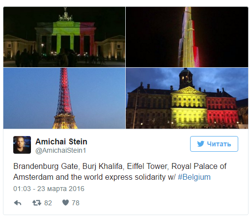 В цвета бельгийского флага - черный, желтый и красный - в знак солидарности с Бельгией, подвергшейся террористическим атакам, подсвечены Эйфелева башня в Париже и Бранденбургские ворота в Берлине.