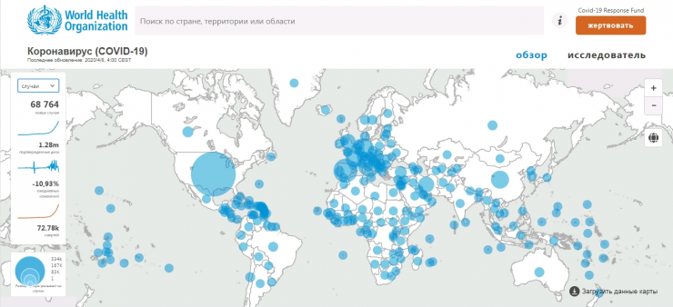 По данным ВОЗ, в мире за последние сутки коронавирусом заразились чуть больше 68 тысяч человек, умерли на 10,93 процента меньше человек по сравнению с предыдущими сутками.