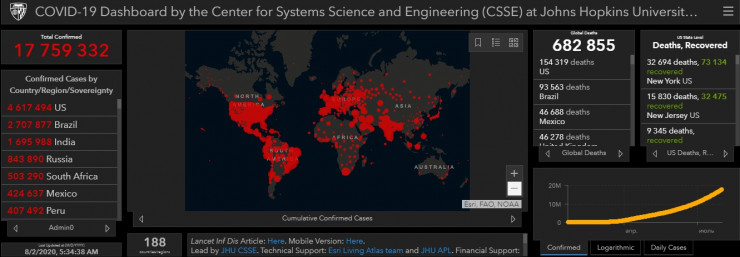 По данным университета, в мире COVID-19 заболели 17 759 332 человека, жертвами инфекции стали 682 855 пациентов, еще 10 484 442 человека выздоровели.