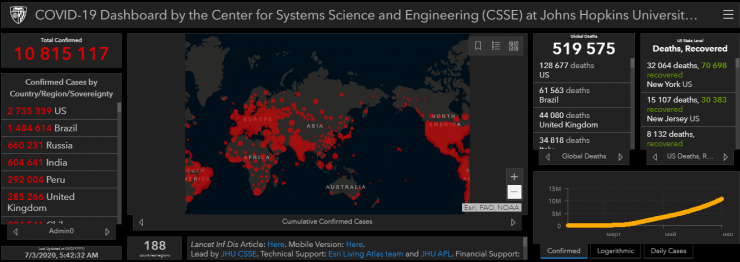 По данным университета, в мире COVID-19 заболели 10 815 117 человек, жертвами инфекции стали 519 575 пациентов, еще 5 592 541 человек выздоровел.
