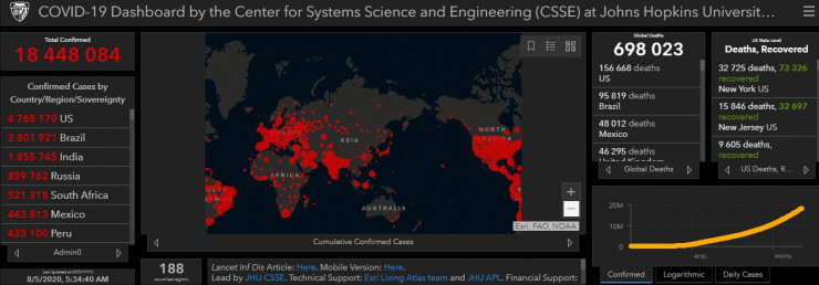 Число заразившихся коронавирусом в мире к утру 5 августа превысило 18,4 миллиона человек. Об этом свидетельствуют данные проекта Университета Джонса Хопкинса, передает корреспондент Tengrinews.kz.