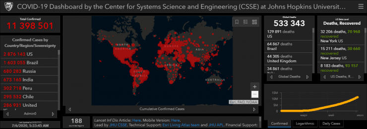 По данным университета, в мире COVID-19 заболел 11 398 501 человек, жертвами инфекции стали 533 343 пациента, еще 6 156 360 человек выздоровели.