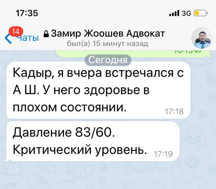 Ссылаясь на адвоката Замира Жоошева, Кадырбек Атамбаев заявил, что у отца в любой момент может случиться инфаркт или инсульт.