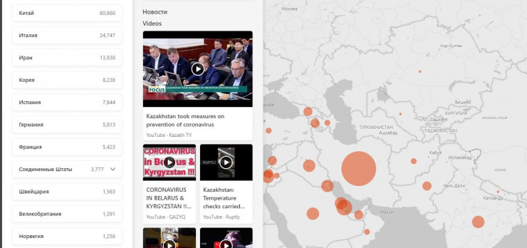 Microsoft разработала интерактивную карту на основе поисковой системы Bing. Кликнув по красному кружку в центре любой страны, можно узнать, сколько на ее территории, согласно официальной статистике ВОЗ, заболевших, излечившихся и умерших от коронавирусной инфекции.