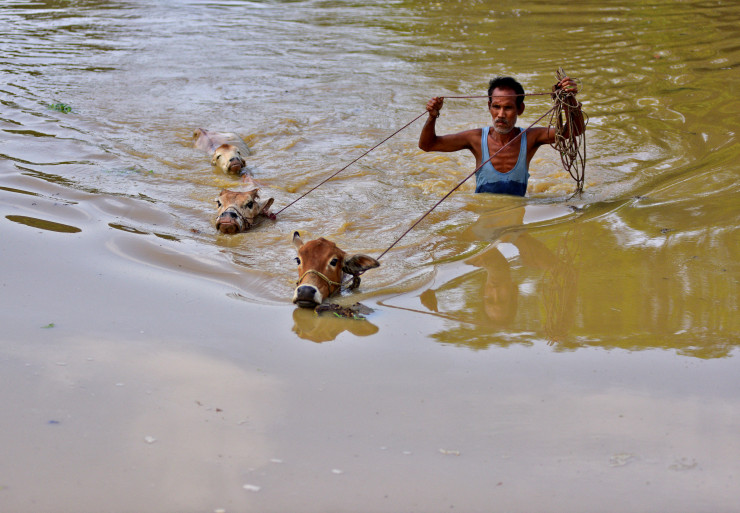 В штате Ассам в соседней Индии целые деревни оказались под водой, в то время как по всему штату затоплено 114 тысяч гектаров посевов и смыто 5000 голов скота.