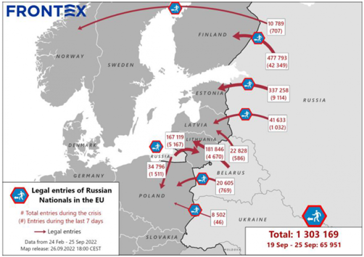 Европейское агентство пограничной и береговой охраны Frontex сообщило, что за последнюю неделю (19-25 сентября) в Евросоюз въехали 66 тысяч россиян. По данным агентства, это на 30 процентов больше, чем за предыдущую неделю. Агентство сообщило, что большинство российских граждан въезжают в ЕС через пограничные пункты Финляндии и Эстонии.