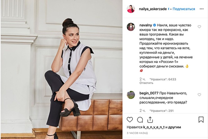 В комментарии к этому посту пришел Алексей Навальный. Он заявил, что яхта телеведущей была куплена на средства, которые россияне жертвовали на лечение больным детям. "Наиля, ваше чувство юмора так же прекрасно, как ваша программа. Какая вы молодец, так и надо. Продолжайте иронизировать над тем, что катаетесь на яхте, купленной на деньги, украденные у детей, на лечение которых на "России-1" собирают деньги эсэмэсками", - написал оппозиционер.