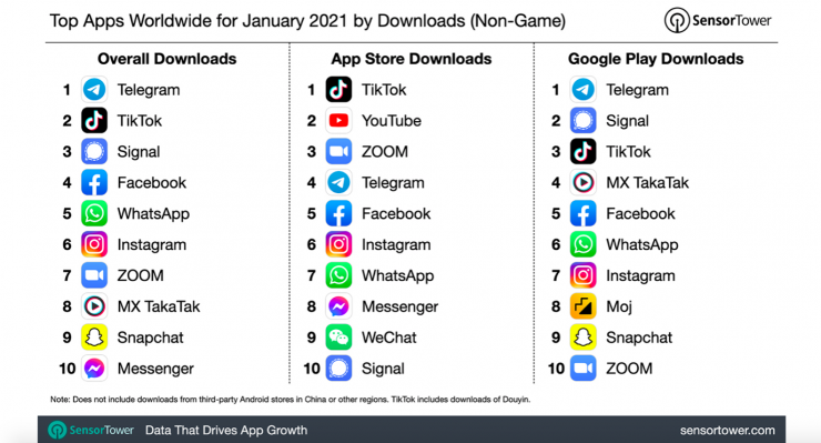 Signal же вообще не входил в декабре в Топ-10 по всем трем категориям. На примерах TikTok и Signal хорошо видна реакция пользователей на попытки WhatsApp внедрить новую политику конфиденциальности.