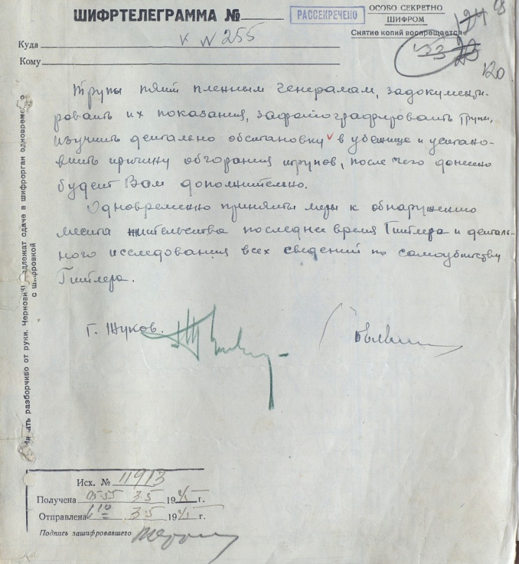Кроме того, по словам Жукова, "одновременно приняты меры к обнаружению места жительства в последнее время Гитлера и детального исследования всех сведений по самоубийству Гитлера".