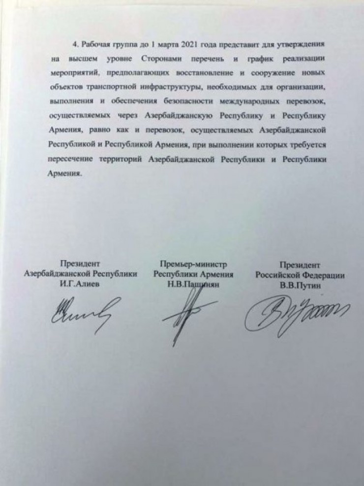 По итогам встречи стороны обнародовали текст совместного заявления России, Армении и Азербайджана. В документе содержится четыре пункта.