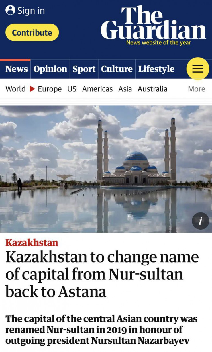 Портал EurasiaNet выпустил статью под заголовком "Казахстан: Столица возвращается к названию Астана после кратковременного пребывания Нур-Султаном". Журналисты сайта подчеркнули, что за свою относительно короткую историю город менял название по меньшей мере шесть раз.