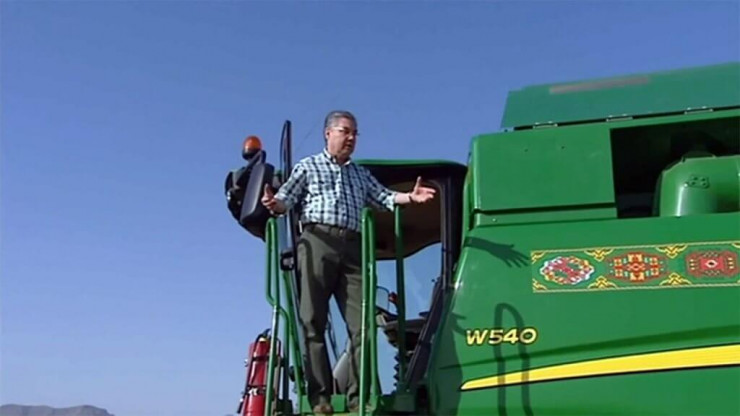 Бердымухамедов осмотрел поле арендатора-хлебороба Тагандурды Байрамгулыева. Глава государства поговорил с дайханином, затем с механизатором Гурбанберды Тувакгеловым и, сев в кабину комбайна John Deere, "принял участие в уборке зерновых".