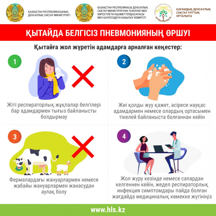 Күні кеше Қазақстанның Денсаулық сақтау министрлігіне қарасты Қоғамдық денсаулық сақтау ұлттық орталығы Қытайда белгісіз дерттердің таралуына байланысты пневмонияның алдын алу туралы мәлімет берді. Орталықтағы жұқпалы аурулардың алдын алу департаментінің маманы Нұрбала Бахтиярқызы пневмония дене қызуының жоғарылауымен, кеуде қуысының ауыруымен, қақырық мол бөлінетін жөтел сияқты белгілермен басталатынын айтып өтті.