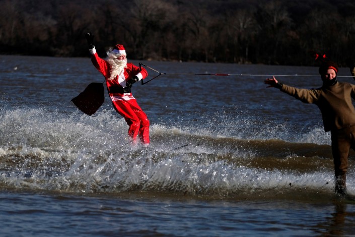 Некоторые жители американского штата Вирджиния из-за отсутствия снега развлекаются на водных лыжах.