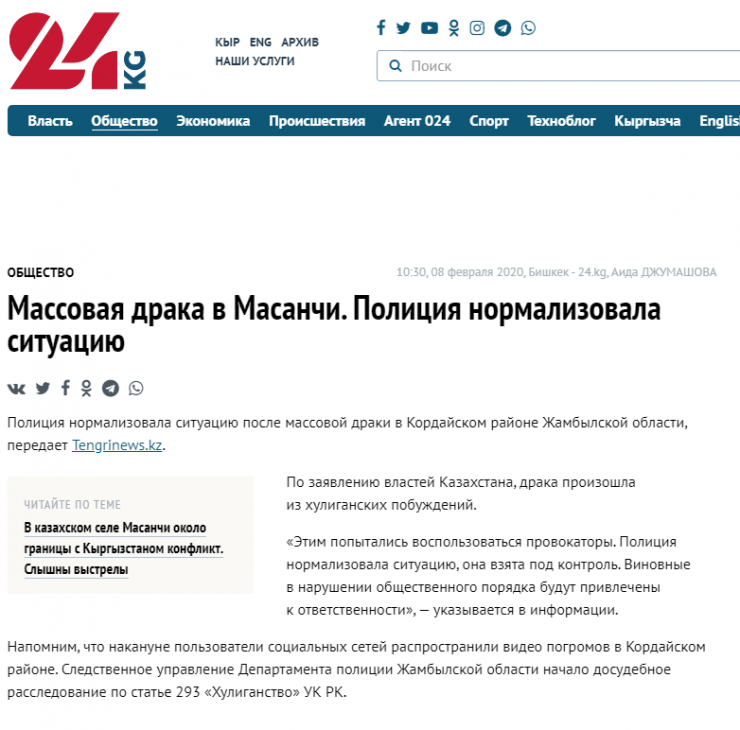РИА Новости ақпарат порталы Қордай ауданындағы оқиғаның мән-жайын бүге-шігесіне дейін таратып отырған ресейлік порталдардың бірі. Сайт қайғылы оқиғаның неден туғанын, себебін және билік өкілдерінің әрекетін баяндаған.