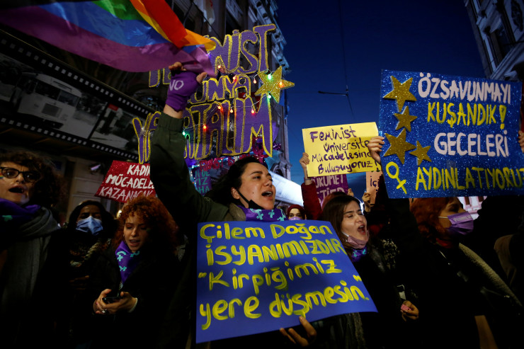 "Мы не молчим, не боимся, не подчиняемся", - скандировали демонстранты и поднимали транспаранты, требуя срочных действий против гендерного насилия в Турции.