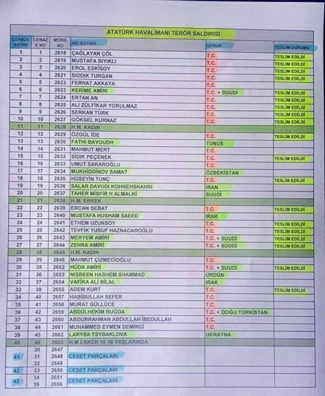 Список погибших. Среди жертв - 23 гражданина Турции, граждане Ирака, Саудовской Аравии, Ирана, Украины, Туниса, Узбекистана, Иордании, Китая.