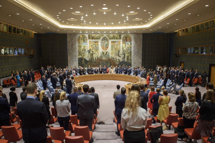 Перед началом заседания члены Совета Безопасности и генеральный секретарь ООН Антониу Гутерриш почтили минутой молчания память бывшего главы ООН Кофи Аннана, ушедшего из жизни 18 августа 2018 года.