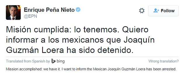 "Миссия завершена: мы поймали его. Я хочу сообщить мексиканцам, что Хоакин Гусман Лоэра был задержан", - написал глава Мексики. "Благодарю кабинет безопасности страны за это важное достижение", - добавил он.