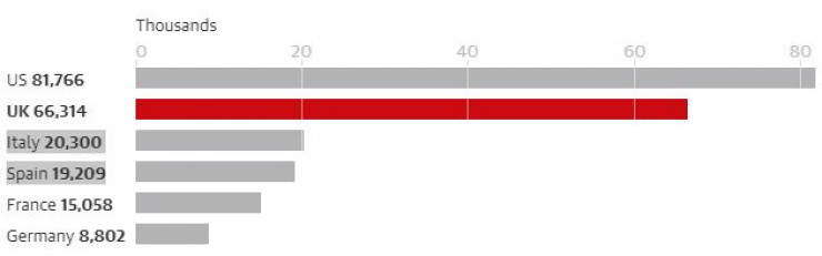 Великобритания с 61 474 зараженными находится на восьмом месте в мире по количеству зарегистрированных случаев. 345 человек вылечились, в то время как 7 111 от осложнений скончались. Таким образом, процент смертности в стране составляет 11,5.