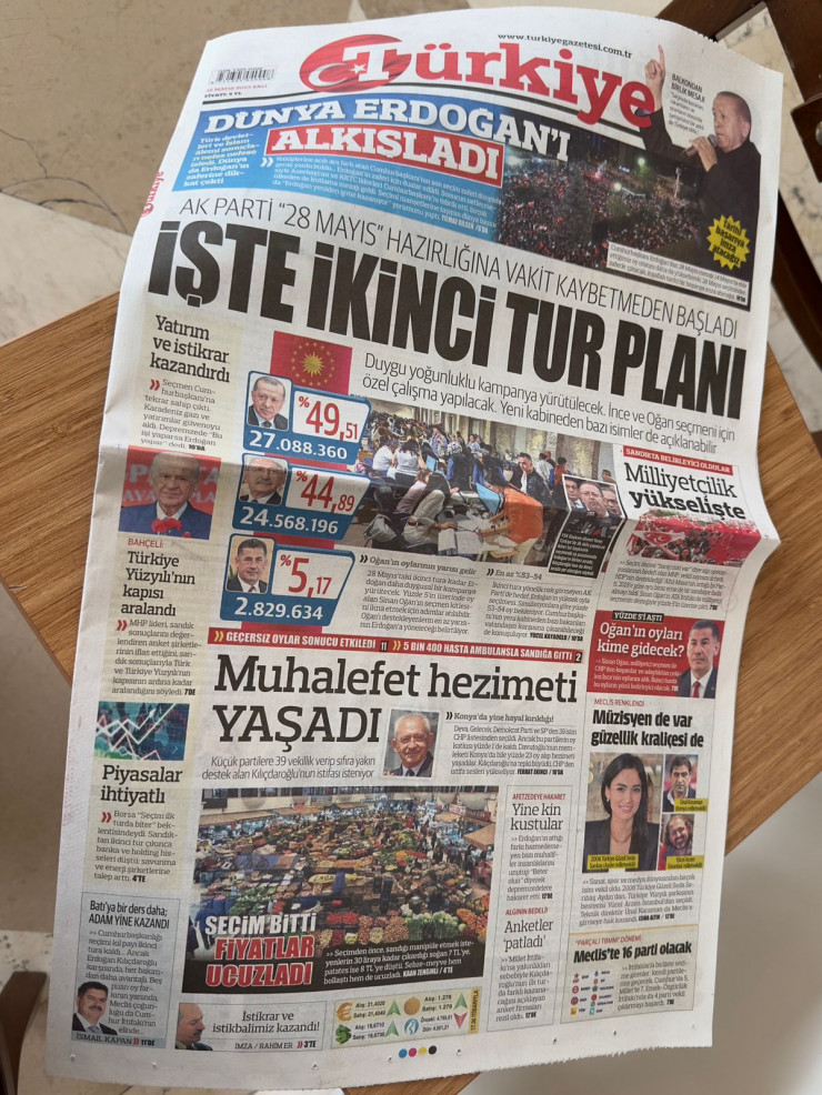 Тема выборов все еще занимает главные полосы турецких газет. Граждане страны, да и весь мир наблюдают за исходом голосования, чтобы узнать, кто же станет следующим президентом Турции.
