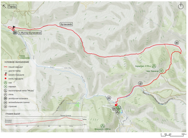 После шлагбаума идите вверх по ущелью по хорошей гравийной дороге до перекрестка троп, ведущих на Бутаковский водопад и направо по ходу движения на перевал Кимасар. Дальше следует идти по тропке, которая идет по склонам, густо проросшим тянь-шанской елью и осиной, которая выведет вас на перевал.
