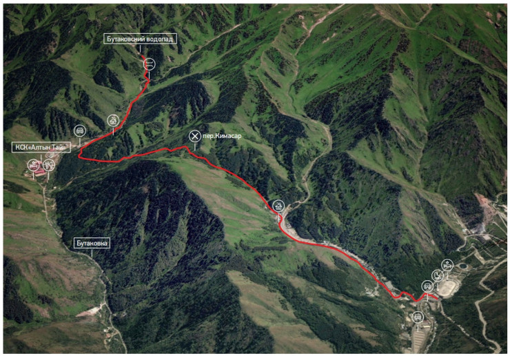 От Медеу идем по маршруту 104 в восточном направлении. Тропа выходит в Бутаковское ущелье выше спорткомплекса. По ущелью ведет проселочная дорога, по которой продолжается путь на юг. Медленный подъем через 30 минут приводит к берегу речки, текущей параллельно дороге, которая переходит в тропу. Тропа поднимается вверх по долине, пересекает ручей и выходит на широкое луговое поле. Правый берег Бутаковки хорошо просматривается на протяжении полукилометра с тропы, идущей по левому берегу. К концу поляны ущелье сильно сужается. В узком месте находится турбаза "Экстрим" - филиал горнолыжного комплекса "Табаган". Тропа раздваивается: одна идет вверх по ущелью, а наш путь лежит по тропе, которая ответвляется в боковое ущелье налево.