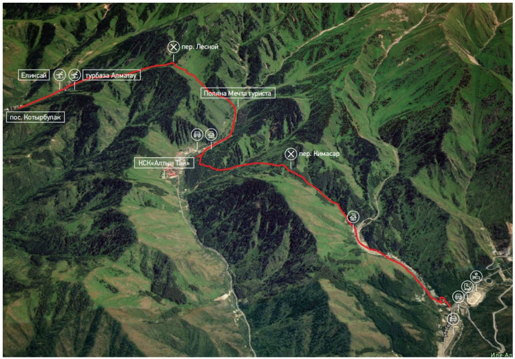 Описание: Медеу - перевал Кимасар (Комиссаровский) - ущелье Бутаковское - поляна "Мечта туриста" - перевал Лесной - вершина Котырбулак - турбаза "Алматау"